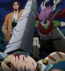 Tomura orders Crematorium to remove Katsuki's restrictions, although Crematorium is not sure since Katsuki might attack, Tomura wants to treat Katsuki as an equal and knows that Katsuki knows that he has no chance to win. Crematorium orders Twice to remove the ties. As Twice removes the restraints, Mister Compress apologizes to Katsuki for forcibly removing him and explains that the Alliance is not just a group of thugs perpetrating crimes and that they did not remove him by accident, he goes on to say that everyone in the Alliance is shackled by the current society and hopes that Katsuki understands their discrimination.